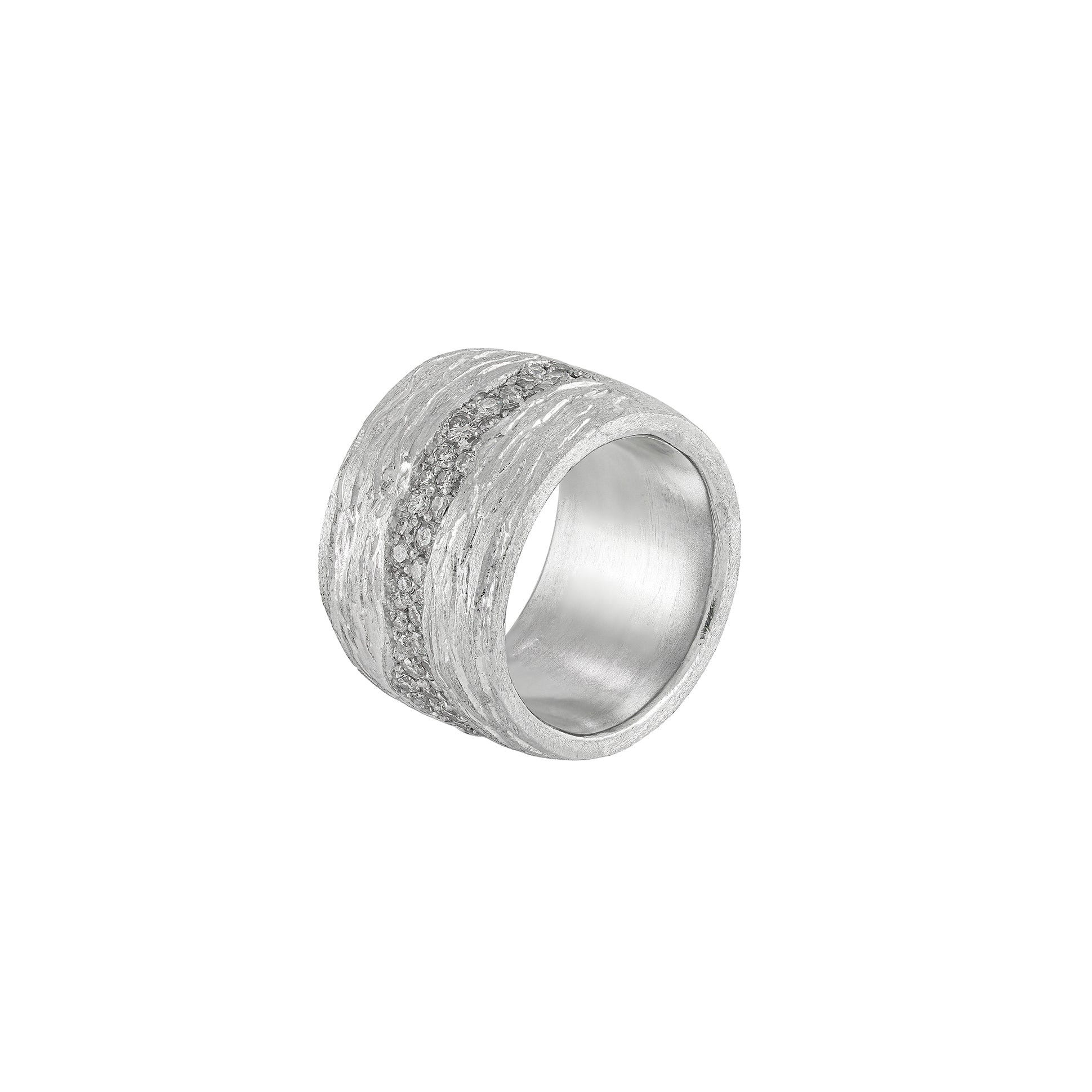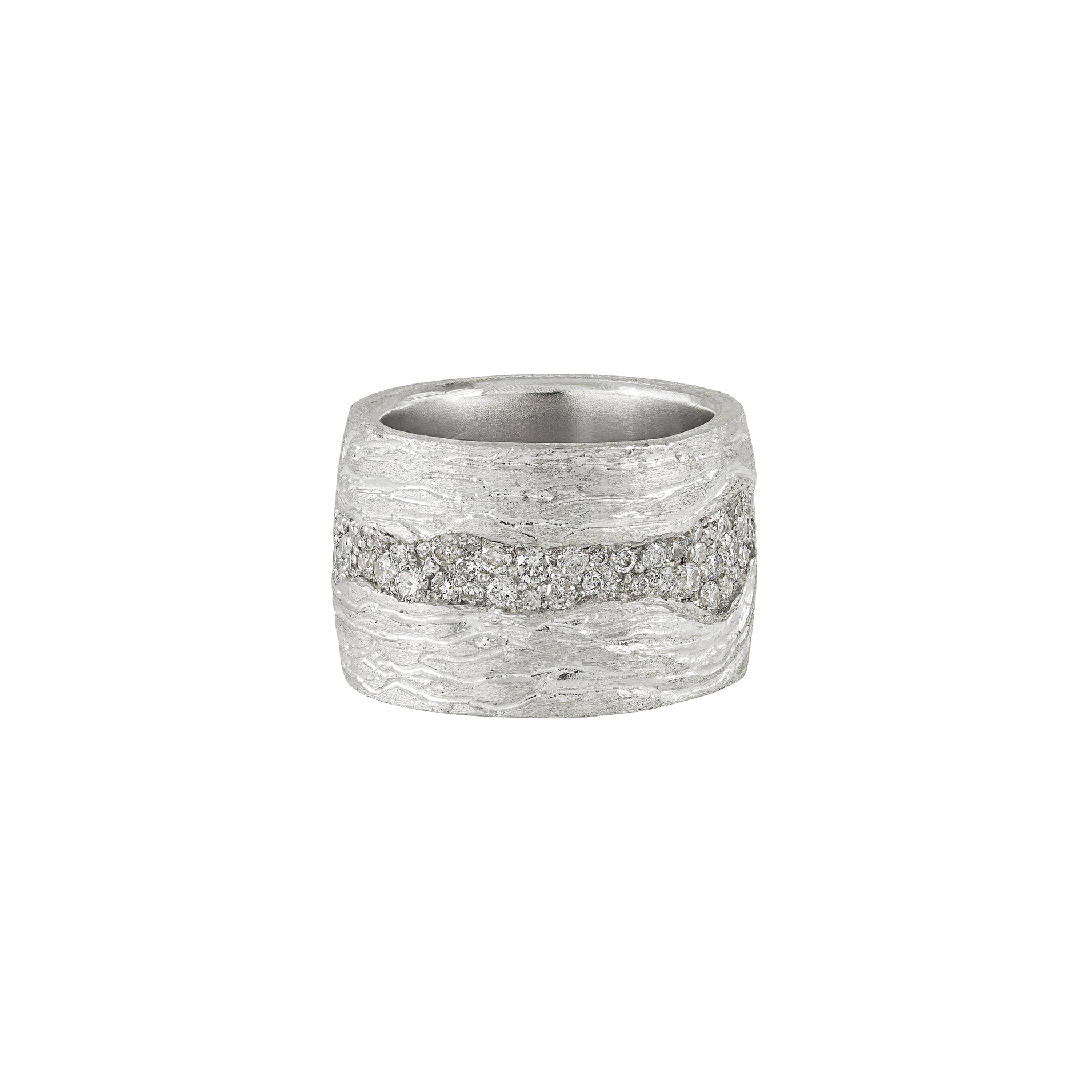 White diamonds appear in contrast precise, luminous, almost fragile against the roughness of the silver.